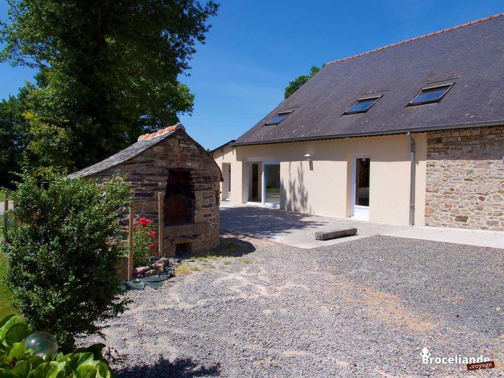Salle ouverte sur une terrasse, une cour et la pelouse entourant le vieux four à pain.